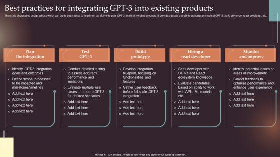 This slide showcases best practices which can guide businesses to help them carefully integrate GPT-3 into their existing products. It provides details about integration planning, test GPT-3, build prototype, react developer, etc. Create an editable Comprehensive Resource Guide To Master GPT 3 Best Practices Integrating GPT 3 Into Existing Products Designs PDF that communicates your idea and engages your audience. Whether youre presenting a business or an educational presentation, pre designed presentation templates help save time. Comprehensive Resource Guide To Master GPT 3 Best Practices Integrating GPT 3 Into Existing Products Designs PDF is highly customizable and very easy to edit, covering many different styles from creative to business presentations. Slidegeeks has creative team members who have crafted amazing templates. So, go and get them without any delay.