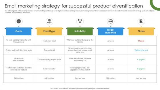 The following slide outlines comprehensive email marketing plan through which digital marketers can target new customer segments and increase sales. Information covered in this slide is related to strategy goals, email types, suitability, target audience, and status. Slidegeeks is here to make your presentations a breeze with Email Marketing Strategy For Successful Product Diversification Infographics PDF With our easy-to-use and customizable templates, you can focus on delivering your ideas rather than worrying about formatting. With a variety of designs to choose from, you are sure to find one that suits your needs. And with animations and unique photos, illustrations, and fonts, you can make your presentation pop. So whether you are giving a sales pitch or presenting to the board, make sure to check out Slidegeeks first