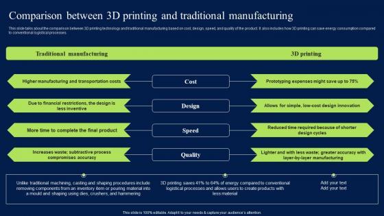 This slide talks about the comparison between 3D printing technology and traditional manufacturing based on cost, design, speed, and quality of the product. It also includes how 3D printing can save energy consumption compared to conventional logistical processes. Are you searching for a Comparison Between 3D Printing And Traditional Manufacturing Professional PDF that is uncluttered, straightforward, and original Its easy to edit, and you can change the colors to suit your personal or business branding. For a presentation that expresses how much effort you have put in, this template is ideal With all of its features, including tables, diagrams, statistics, and lists, its perfect for a business plan presentation. Make your ideas more appealing with these professional slides. Download Comparison Between 3D Printing And Traditional Manufacturing Professional PDF from Slidegeeks today. This slide talks about the comparison between 3D printing technology and traditional manufacturing based on cost, design, speed, and quality of the product. It also includes how 3D printing can save energy consumption compared to conventional logistical processes.