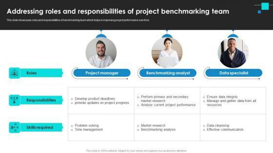 This slide showcases roles and responsibilities of benchmarking team which helps in improving project performance over time. Slidegeeks is one of the best resources for PowerPoint templates. You can download easily and regulate Project Benchmarking Process Addressing Roles And Responsibilities Of Project CRP DK SS V for your personal presentations from our wonderful collection. A few clicks is all it takes to discover and get the most relevant and appropriate templates. Use our Templates to add a unique zing and appeal to your presentation and meetings. All the slides are easy to edit and you can use them even for advertisement purposes. This slide showcases roles and responsibilities of benchmarking team which helps in improving project performance over time.
