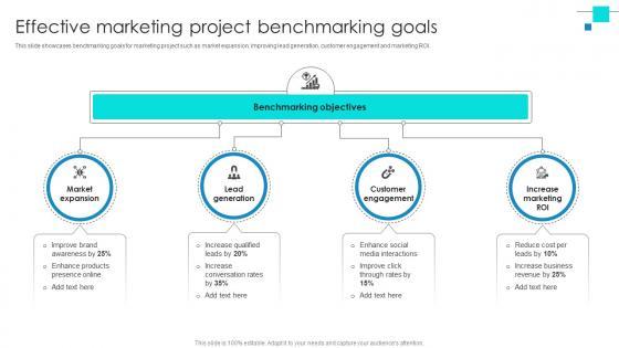 This slide showcases benchmarking goals for marketing project such as market expansion, improving lead generation, customer engagement and marketing ROI. Crafting an eye-catching presentation has never been more straightforward. Let your presentation shine with this tasteful yet straightforward Project Benchmarking Process Effective Marketing Project Benchmarking Goals CRP DK SS V template. It offers a minimalistic and classy look that is great for making a statement. The colors have been employed intelligently to add a bit of playfulness while still remaining professional. Construct the ideal Project Benchmarking Process Effective Marketing Project Benchmarking Goals CRP DK SS V that effortlessly grabs the attention of your audience Begin now and be certain to wow your customers This slide showcases benchmarking goals for marketing project such as market expansion, improving lead generation, customer engagement and marketing ROI.