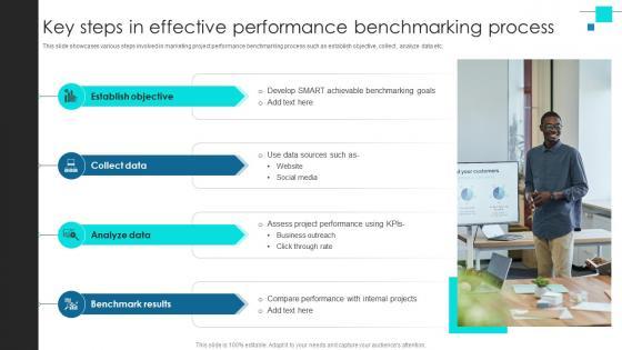 This slide showcases various steps involved in marketing project performance benchmarking process such as establish objective, collect , analyze data etc. Slidegeeks has constructed Project Benchmarking Process Key Steps In Effective Performance Benchmarking CRP DK SS V after conducting extensive research and examination. These presentation templates are constantly being generated and modified based on user preferences and critiques from editors. Here, you will find the most attractive templates for a range of purposes while taking into account ratings and remarks from users regarding the content. This is an excellent jumping-off point to explore our content and will give new users an insight into our top-notch PowerPoint Templates. This slide showcases various steps involved in marketing project performance benchmarking process such as establish objective, collect , analyze data etc.