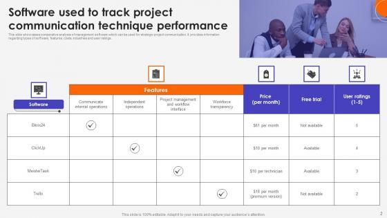 This slide showcases comparative analysis of management software which can be used for strategic project communication. It provides information regarding types of software, features, costs, industries and user ratings. Pitch your topic with ease and precision using this Software Used To Track Project Communication Technique Performance Mockup Pdf. This layout presents information on Software, Features. It is also available for immediate download and adjustment. So, changes can be made in the color, design, graphics or any other component to create a unique layout. This slide showcases comparative analysis of management software which can be used for strategic project communication. It provides information regarding types of software, features, costs, industries and user ratings.