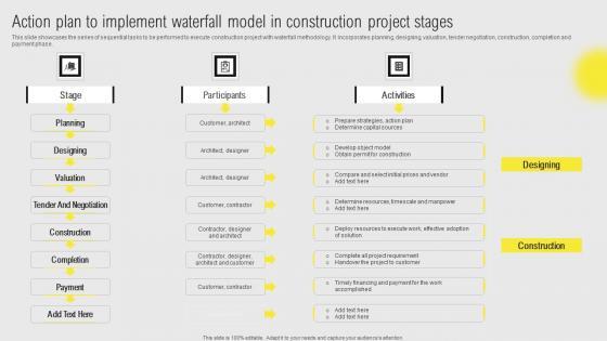 This slide showcases the series of sequential tasks to be performed to execute construction project with waterfall methodology. It incorporates planning, designing, valuation, tender negotiation, construction, completion and payment phase. Do you have to make sure that everyone on your team knows about any specific topic I yes, then you should give Action Plan Implement Waterfall Project Management Strategy Construction Industry Themes Pdf a try. Our experts have put a lot of knowledge and effort into creating this impeccable Action Plan Implement Waterfall Project Management Strategy Construction Industry Themes Pdf. You can use this template for your upcoming presentations, as the slides are perfect to represent even the tiniest detail. You can download these templates from the Slidegeeks website and these are easy to edit. So grab these today This slide showcases the series of sequential tasks to be performed to execute construction project with waterfall methodology. It incorporates planning, designing, valuation, tender negotiation, construction, completion and payment phase.
