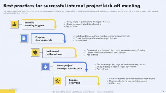 This slide exhibits internal project kick off tips to help team understand project better and increase efficiency. Its key steps are identify meeting triggers, prepare strong agenda, initiate call with customer, select project manager quarterback and engage everyone. Persuade your audience using this Best Practices For Successful Internal Project Kick Off Meeting Mockup PDF. This PPT design covers five stages, thus making it a great tool to use. It also caters to a variety of topics including Meeting Triggers, Customer, Manager Quarterback. Download this PPT design now to present a convincing pitch that not only emphasizes the topic but also showcases your presentation skills.