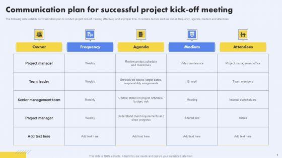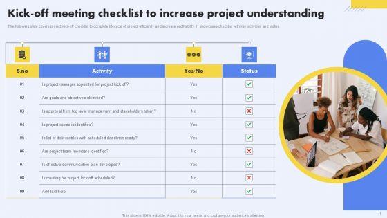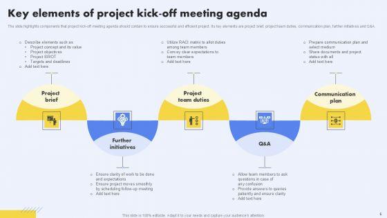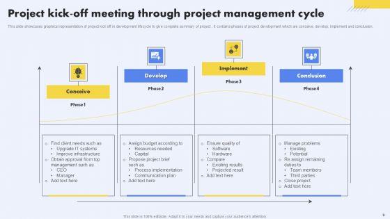 Share a great deal of information on the topic by deploying this Project Kick Off Meeting Ppt PowerPoint Presentation Complete Deck With Slides. Support your ideas and thought process with this prefabricated set. It includes a set of twelve slides, all fully modifiable and editable. Each slide can be restructured and induced with the information and content of your choice. You can add or remove large content boxes as well, to make this PPT slideshow more personalized. Its high-quality graphics and visuals help in presenting a well-coordinated pitch. This PPT template is also a resourceful tool to take visual cues from and implement the best ideas to help your business grow and expand. The main attraction of this well-formulated deck is that everything is editable, giving you the freedom to adjust it to your liking and choice. Changes can be made in the background and theme as well to deliver an outstanding pitch. Therefore, click on the download button now to gain full access to this multifunctional set.