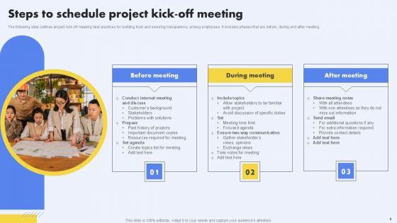 The following slide outlines project kick off meeting best practices for building trust and ensuring transparency among employees. It includes phases that are before, during and after meeting. Persuade your audience using this Steps To Schedule Project Kick Off Meeting Formats PDF. This PPT design covers three stages, thus making it a great tool to use. It also caters to a variety of topics including Before Meeting, During Meeting, After Meeting. Download this PPT design now to present a convincing pitch that not only emphasizes the topic but also showcases your presentation skills.