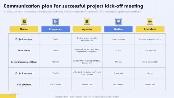 The following slide exhibits communication plan to conduct project kick-off meeting effectively and at proper time. It contains factors such as owner, frequency, agenda, medium and attendees. Showcasing this set of slides titled Communication Plan For Successful Project Kick Off Meeting Professional PDF. The topics addressed in these templates are Owner, Frequency, Agenda. All the content presented in this PPT design is completely editable. Download it and make adjustments in color, background, font etc. as per your unique business setting.