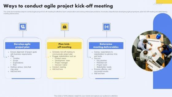 The slide demonstrates steps to conduct agile project kick-off meeting for effective team collaboration and solving unforeseen problems. It includes steps that are developing agile project plan, plan kick-off meeting and determining meeting deliverables. Presenting Ways To Conduct Agile Project Kick Off Meeting Ideas PDF to dispense important information. This template comprises three stages. It also presents valuable insights into the topics including Project Plan, Meeting, Meeting Deliverables. This is a completely customizable PowerPoint theme that can be put to use immediately. So, download it and address the topic impactfully.