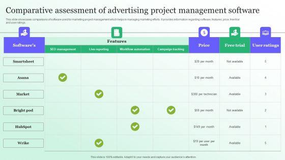 This slide showcases comparisons of software used for marketing project management which helps in managing marketing efforts. It provides information regarding software, features, price, free trial and user ratings.Showcasing this set of slides titled Comparative Assessment Of Advertising Project Management Software Designs PDF. The topics addressed in these templates are SEO Management, Live Reporting, Workflow Automation, Campaign Tracking. All the content presented in this PPT design is completely editable. Download it and make adjustments in color, background, font etc. as per your unique business setting.