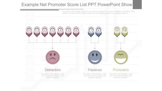 This is a example net promoter score list ppt powerpoint show. This is a three stage process. The stages in this process are detractors, passives, promoters.