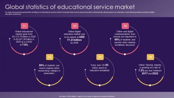Tis slide showcases the global facts and figures of educational service market. It includes facts such as global education market growth, global expense on education, online tutoring industry and global digital education market size Whether you have daily or monthly meetings, a brilliant presentation is necessary. Global Statistics Of Educational Service School Promotion Strategies Increase Enrollment Structure Pdf can be your best option for delivering a presentation. Represent everything in detail using Global Statistics Of Educational Service School Promotion Strategies Increase Enrollment Structure Pdf and make yourself stand out in meetings. The template is versatile and follows a structure that will cater to your requirements. All the templates prepared by Slidegeeks are easy to download and edit. Our research experts have taken care of the corporate themes as well. So, give it a try and see the results. Tis slide showcases the global facts and figures of educational service market. It includes facts such as global education market growth, global expense on education, online tutoring industry and global digital education market size