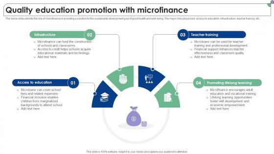 The below slide exhibits the role of microfinance in providing a solution for the sustainable development goal of good health and well-being. The major roles played are access to education, infrastructure, teacher training, etc. Explore a selection of the finest Quality Education Promotion With Microfinance Complete Guide To Microfinance Fin SS V here. With a plethora of professionally designed and pre-made slide templates, you can quickly and easily find the right one for your upcoming presentation. You can use our Quality Education Promotion With Microfinance Complete Guide To Microfinance Fin SS V to effectively convey your message to a wider audience. Slidegeeks has done a lot of research before preparing these presentation templates. The content can be personalized and the slides are highly editable. Grab templates today from Slidegeeks. The below slide exhibits the role of microfinance in providing a solution for the sustainable development goal of good health and well-being. The major roles played are access to education, infrastructure, teacher training, etc.