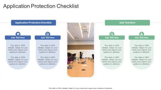 Presenting our innovatively-designed set of slides titled Application Protection Checklist In Powerpoint And Google Slides Cpb. This completely editable PowerPoint graphic exhibits Application Protection Checklist that will help you convey the message impactfully. It can be accessed with Google Slides and is available in both standard screen and widescreen aspect ratios. Apart from this, you can download this well-structured PowerPoint template design in different formats like PDF, JPG, and PNG. So, click the download button now to gain full access to this PPT design. Our Application Protection Checklist In Powerpoint And Google Slides Cpb are topically designed to provide an attractive backdrop to any subject. Use them to look like a presentation pro.