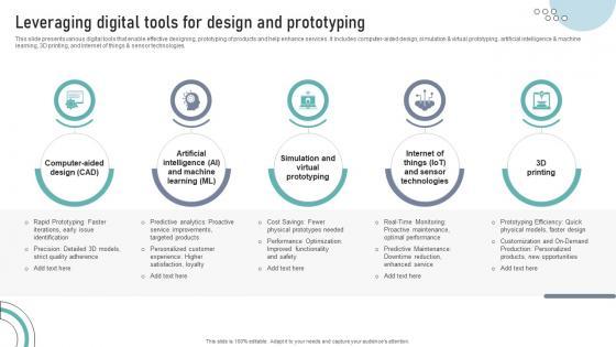 This slide presents various digital tools that enable effective designing, prototyping of products and help enhance services. It includes computer-aided design, simulation and virtual prototyping, artificial intelligence and machine learning, 3D printing, and internet of things and sensor technologies.Present like a pro with Leveraging Digital Tools For Design And Prototyping DT SS V. Create beautiful presentations together with your team, using our easy-to-use presentation slides. Share your ideas in real-time and make changes on the fly by downloading our templates. So whether you are in the office, on the go, or in a remote location, you can stay in sync with your team and present your ideas with confidence. With Slidegeeks presentation got a whole lot easier. Grab these presentations today. This slide presents various digital tools that enable effective designing, prototyping of products and help enhance services. It includes computer-aided design, simulation and virtual prototyping, artificial intelligence and machine learning, 3D printing, and internet of things and sensor technologies.