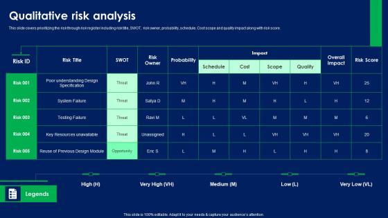 This slide covers prioritizing the risk through risk register including risk title, SWOT, risk owner, probability, schedule. Cost scope and quality impact along with risk score. Do you have an important presentation coming up Are you looking for something that will make your presentation stand out from the rest Look no further than Quality Assessment Qualitative Risk Analysis Portrait PDF. With our professional designs, you can trust that your presentation will pop and make delivering it a smooth process. And with Slidegeeks, you can trust that your presentation will be unique and memorable. So why wait Grab Quality Assessment Qualitative Risk Analysis Portrait PDF today and make your presentation stand out from the rest.