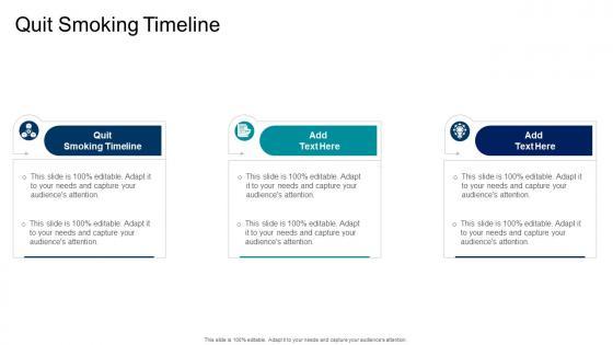 Presenting our innovatively designed set of slides titled Quit Smoking Timeline In Powerpoint And Google Slides Cpb. This completely editable PowerPoint graphic exhibits Quit Smoking Timeline that will help you convey the message impactfully. It can be accessed with Google Slides and is available in both standard screen and widescreen aspect ratios. Apart from this, you can download this well structured PowerPoint template design in different formats like PDF, JPG, and PNG. So, click the download button now to gain full access to this PPT design. Our Quit Smoking Timeline In Powerpoint And Google Slides Cpb are topically designed to provide an attractive backdrop to any subject. Use them to look like a presentation pro.