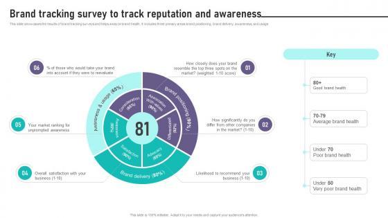 This slide showcases the results of brand tracking surveys and helps analyze brand health. It includes three primary areas brand positioning, brand delivery, awareness, and usage. Slidegeeks is here to make your presentations a breeze with Brand Equity Management To Raise Brand Tracking Survey To Track Reputation And Awareness With our easy-to-use and customizable templates, you can focus on delivering your ideas rather than worrying about formatting. With a variety of designs to choose from, you are sure to find one that suits your needs. And with animations and unique photos, illustrations, and fonts, you can make your presentation pop. So whether you are giving a sales pitch or presenting to the board, make sure to check out Slidegeeks first This slide showcases the results of brand tracking surveys and helps analyze brand health. It includes three primary areas brand positioning, brand delivery, awareness, and usage.