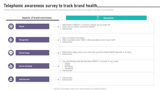 This slide presents a set of brand-tracking survey questions to be conducted by telephone to analyze brand awareness. It includes recall, recognition, brand image, and brand attributes. If your project calls for a presentation, then Slidegeeks is your go-to partner because we have professionally designed, easy-to-edit templates that are perfect for any presentation. After downloading, you can easily edit Brand Equity Management To Raise Telephonic Awareness Survey To Track Brand Health and make the changes accordingly. You can rearrange slides or fill them with different images. Check out all the handy templates This slide presents a set of brand-tracking survey questions to be conducted by telephone to analyze brand awareness. It includes recall, recognition, brand image, and brand attributes.