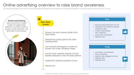 This slide provides glimpse about summary of online advertising that can help the travel businesses to drive more traffic to their platform. It includes description, how does it work, pros, cons, etc. Present like a pro with Tour And Travel Agency Marketing Online Advertising Overview To Raise Brand Awareness Infographics PDF Create beautiful presentations together with your team, using our easy-to-use presentation slides. Share your ideas in real-time and make changes on the fly by downloading our templates. So whether you are in the office, on the go, or in a remote location, you can stay in sync with your team and present your ideas with confidence. With Slidegeeks presentation got a whole lot easier. Grab these presentations today.