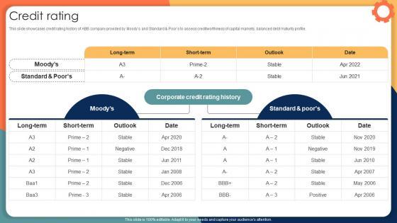 This slide showcases credit rating history of ABB company provided by Moodys and Standard and Poors to assess creditworthiness of capital markets, balanced debt maturity profile. From laying roadmaps to briefing everything in detail, our templates are perfect for you. You can set the stage with your presentation slides. All you have to do is download these easy-to-edit and customizable templates. Credit Rating Engineering Solution Provider Company Profile CP SS V will help you deliver an outstanding performance that everyone would remember and praise you for. Do download this presentation today. This slide showcases credit rating history of ABB company provided by Moodys and Standard and Poors to assess creditworthiness of capital markets, balanced debt maturity profile.