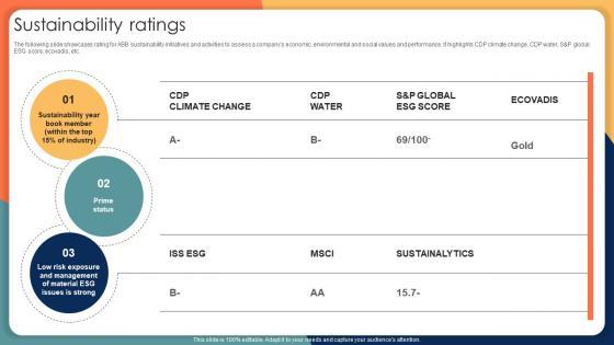 The following slide showcases rating for ABB sustainability initiatives and activities to assess a companys economic, environmental and social values and performance. It highlights CDP climate change, CDP water, SandP global ESG score, ecovadis, etc. Create an editable Sustainability Ratings Engineering Solution Provider Company Profile CP SS V that communicates your idea and engages your audience. Whether you are presenting a business or an educational presentation, pre-designed presentation templates help save time. Sustainability Ratings Engineering Solution Provider Company Profile CP SS V is highly customizable and very easy to edit, covering many different styles from creative to business presentations. Slidegeeks has creative team members who have crafted amazing templates. So, go and get them without any delay. The following slide showcases rating for ABB sustainability initiatives and activities to assess a companys economic, environmental and social values and performance. It highlights CDP climate change, CDP water, SandP global ESG score, ecovadis, etc.