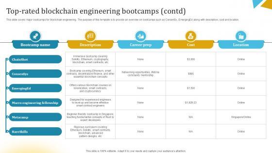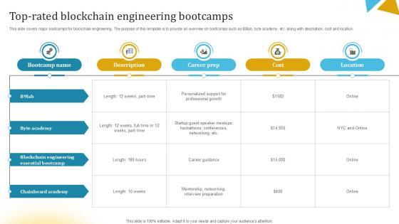 This slide covers major bootcamps for blockchain engineering. The purpose of this template is to provide an overview on bootcamps such as B9lab, byte academy, etc. along with description, cost and location. Do you have an important presentation coming up Are you looking for something that will make your presentation stand out from the rest Look no further than Top Rated Blockchain Engineering Bootcamps PPT Example BCT SS V. With our professional designs, you can trust that your presentation will pop and make delivering it a smooth process. And with Slidegeeks, you can trust that your presentation will be unique and memorable. So why wait Grab Top Rated Blockchain Engineering Bootcamps PPT Example BCT SS V today and make your presentation stand out from the rest This slide covers major bootcamps for blockchain engineering. The purpose of this template is to provide an overview on bootcamps such as B9lab, byte academy, etc. along with description, cost and location.