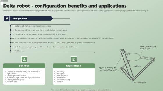 This slide talks about the advantages and structural arrangement of delta robot. The purpose of this slide is to outline the various applications of delta robot. Their key applications are assembly, packaging, part transfer, material handling, etc. Are you in need of a template that can accommodate all of your creative concepts This one is crafted professionally and can be altered to fit any style. Use it with Google Slides or PowerPoint. Include striking photographs, symbols, depictions, and other visuals. Fill, move around, or remove text boxes as desired. Test out color palettes and font mixtures. Edit and save your work, or work with colleagues. Download Delta Robot Configuration Benefits Applications Of Industrial Robots Inspiration Pdf and observe how to make your presentation outstanding. Give an impeccable presentation to your group and make your presentation unforgettable. This slide talks about the advantages and structural arrangement of delta robot. The purpose of this slide is to outline the various applications of delta robot. Their key applications are assembly, packaging, part transfer, material handling, etc.