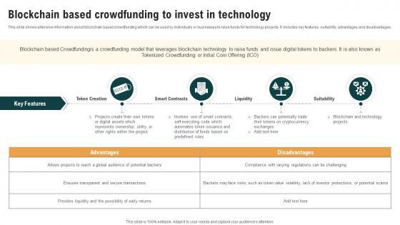 This slide shows extensive information about blockchain based crowdfunding which can be used by individuals or businesses to raise funds for technology projects. It includes key features, suitability, advantages and disadvantages. Boost your pitch with our creative Blockchain Based Crowdfunding To Invest In Technology Real Estate Crowdfunding To Unlock Fin SS V. Deliver an awe-inspiring pitch that will mesmerize everyone. Using these presentation templates you will surely catch everyones attention. You can browse the ppts collection on our website. We have researchers who are experts at creating the right content for the templates. So you do not have to invest time in any additional work. Just grab the template now and use them. This slide shows extensive information about blockchain based crowdfunding which can be used by individuals or businesses to raise funds for technology projects. It includes key features, suitability, advantages and disadvantages.