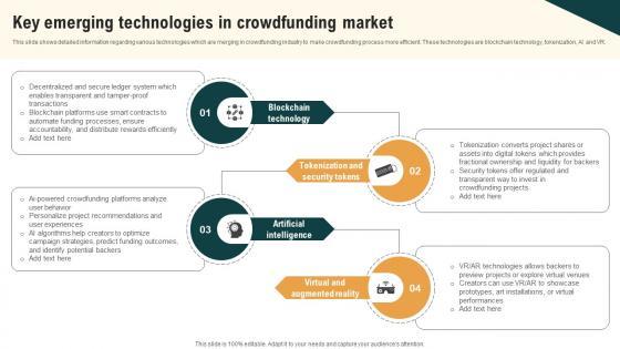 This slide shows detailed information regarding various technologies which are merging in crowdfunding industry to make crowdfunding process more efficient. These technologies are blockchain technology, tokenization, AI and VR. The Key Emerging Technologies In Crowdfunding Real Estate Crowdfunding To Unlock Fin SS V is a compilation of the most recent design trends as a series of slides. It is suitable for any subject or industry presentation, containing attractive visuals and photo spots for businesses to clearly express their messages. This template contains a variety of slides for the user to input data, such as structures to contrast two elements, bullet points, and slides for written information. Slidegeeks is prepared to create an impression. This slide shows detailed information regarding various technologies which are merging in crowdfunding industry to make crowdfunding process more efficient. These technologies are blockchain technology, tokenization, AI and VR.