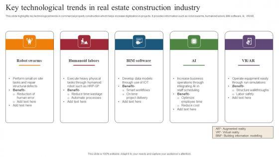 This slide highlights key technological trends in commercial property construction which helps increase digitization in projects. It provides information such as robot swarms, humanoid labors, BIM software, AI, VRAR. Pitch your topic with ease and precision using this Key Technological Trends In Real Estate Construction Industry Graphics Pdf. This layout presents information on Robot Swarms, Humanoid Labors, Software. It is also available for immediate download and adjustment. So, changes can be made in the color, design, graphics or any other component to create a unique layout. This slide highlights key technological trends in commercial property construction which helps increase digitization in projects. It provides information such as robot swarms, humanoid labors, BIM software, AI, VRAR.