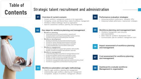 Explore a selection of the finest Table Of Contents Strategic Talent Recruitment And Administration Information Pdf here. With a plethora of professionally designed and pre-made slide templates, you can quickly and easily find the right one for your upcoming presentation. You can use our Table Of Contents Strategic Talent Recruitment And Administration Information Pdf to effectively convey your message to a wider audience. Slidegeeks has done a lot of research before preparing these presentation templates. The content can be personalized and the slides are highly editable. Grab templates today from Slidegeeks. Our Table Of Contents Strategic Talent Recruitment And Administration Information Pdf are topically designed to provide an attractive backdrop to any subject. Use them to look like a presentation pro.