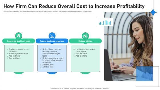 The purpose of this slide is to provide the information regarding the cost of various marketing activities and the benefits associated to these activities. Crafting an eye-catching presentation has never been more straightforward. Let your presentation shine with this tasteful yet straightforward How Firm Can Reduce Overall Cost To Increasing Profitability Through Better Product template. It offers a minimalistic and classy look that is great for making a statement. The colors have been employed intelligently to add a bit of playfulness while still remaining professional. Construct the ideal How Firm Can Reduce Overall Cost To Increasing Profitability Through Better Product that effortlessly grabs the attention of your audience Begin now and be certain to wow your customers The purpose of this slide is to provide the information regarding the cost of various marketing activities and the benefits associated to these activities.