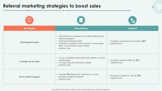 This slide showcases essential strategies to increase sales through referral marketing. Major strategies covered are send targeted emails, leverage social media and set-up referral programs. Get a simple yet stunning designed Offline Media Channel Analysis Referral Marketing Strategies To Boost Sales Information PDF. It is the best one to establish the tone in your meetings. It is an excellent way to make your presentations highly effective. So, download this PPT today from Slidegeeks and see the positive impacts. Our easy-to-edit Offline Media Channel Analysis Referral Marketing Strategies To Boost Sales Information PDF can be your go-to option for all upcoming conferences and meetings. So, what are you waiting for Grab this template today.
