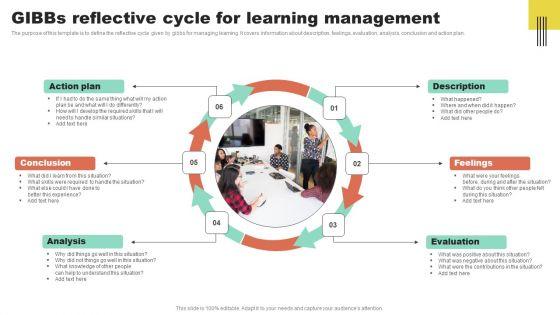 This slide defines the GIBBS reflective cycle used for learning process. It includes information related to description, feelings, evaluation, analysis, conclusion and action plan. Presenting Learning Process In Gibbs Reflective Cycle Introduction PDF to dispense important information. This template comprises six stages. It also presents valuable insights into the topics including Description, Evaluation, Conclusion. This is a completely customizable PowerPoint theme that can be put to use immediately. So, download it and address the topic impactfully.