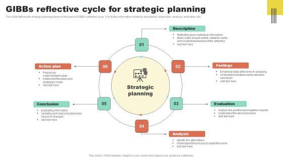 This slide defines the strategic planning done on the basis of GIBBS reflective cycle. It includes information related to description, action plan, analysis, evaluation, etc. Presenting Gibbs Reflective Cycle For Strategic Planning Structure PDF to dispense important information. This template comprises six stages. It also presents valuable insights into the topics including Description, Feelings, Evaluation. This is a completely customizable PowerPoint theme that can be put to use immediately. So, download it and address the topic impactfully.