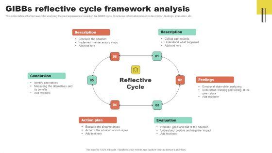 This slide defines the framework for analyzing the past experiences based on the GIBBS cycle. It includes information related to description, feelings , evaluation, etc. Presenting Gibbs Reflective Cycle Framework Analysis Microsoft PDF to dispense important information. This template comprises six stages. It also presents valuable insights into the topics including Conclusion, Action Plan, Evaluation. This is a completely customizable PowerPoint theme that can be put to use immediately. So, download it and address the topic impactfully.