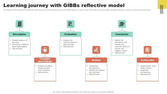 The purpose of this template is to define the learning journey of an individual based on the GIBBS reflective model. It covers information about description, thoughts, evaluation, analysis, conclusion and action plan. Presenting Learning Journey With Gibbs Reflective Model Slides PDF to dispense important information. This template comprises six stages. It also presents valuable insights into the topics including Description, Evaluation, Conclusion. This is a completely customizable PowerPoint theme that can be put to use immediately. So, download it and address the topic impactfully.