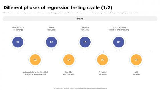 This slide represents the various steps that a code needs to undergo while performing regression testing. These phases of the regression cycle include writing regression tests, finding and resolving bugs, running tests, etc. This modern and well-arranged Different Phases Of Regression Testing Cycle 1 2 Corrective Regression Testing Ppt Powerpoint provides lots of creative possibilities. It is very simple to customize and edit with the Powerpoint Software. Just drag and drop your pictures into the shapes. All facets of this template can be edited with Powerpoint, no extra software is necessary. Add your own material, put your images in the places assigned for them, adjust the colors, and then you can show your slides to the world, with an animated slide included. This slide represents the various steps that a code needs to undergo while performing regression testing. These phases of the regression cycle include writing regression tests, finding and resolving bugs, running tests, etc.