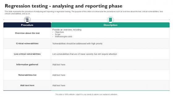 This slide represents the procedure of analysing and reporting in regression testing. The purpose of this slide is to showcase the procedures such as overview about the test, critical vulnerabilities, less critical vulnerabilities, and so on. From laying roadmaps to briefing everything in detail, our templates are perfect for you. You can set the stage with your presentation slides. All you have to do is download these easy-to-edit and customizable templates. Regression Testing Analysing And Reporting Phase Corrective Regression Testing Ppt Sample will help you deliver an outstanding performance that everyone would remember and praise you for. Do download this presentation today. This slide represents the procedure of analysing and reporting in regression testing. The purpose of this slide is to showcase the procedures such as overview about the test, critical vulnerabilities, less critical vulnerabilities, and so on.
