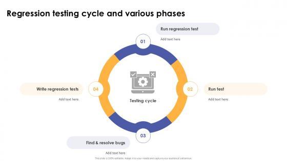If you are looking for a format to display your unique thoughts, then the professionally designed Regression Testing Cycle And Various Phases Corrective Regression Testing Ppt Template is the one for you. You can use it as a Google Slides template or a PowerPoint template. Incorporate impressive visuals, symbols, images, and other charts. Modify or reorganize the text boxes as you desire. Experiment with shade schemes and font pairings. Alter, share or cooperate with other people on your work. Download Regression Testing Cycle And Various Phases Corrective Regression Testing Ppt Template and find out how to give a successful presentation. Present a perfect display to your team and make your presentation unforgettable. Our Regression Testing Cycle And Various Phases Corrective Regression Testing Ppt Template are topically designed to provide an attractive backdrop to any subject. Use them to look like a presentation pro.