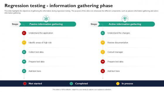 This slide highlights the objectives of gathering the information during regression testing. The purpose of this slide is to showcase the different components, such as passive information gathering and active information gathering. Present like a pro with Regression Testing Information Gathering Phase Corrective Regression Testing Ppt Template. Create beautiful presentations together with your team, using our easy-to-use presentation slides. Share your ideas in real-time and make changes on the fly by downloading our templates. So whether you are in the office, on the go, or in a remote location, you can stay in sync with your team and present your ideas with confidence. With Slidegeeks presentation got a whole lot easier. Grab these presentations today. This slide highlights the objectives of gathering the information during regression testing. The purpose of this slide is to showcase the different components, such as passive information gathering and active information gathering.