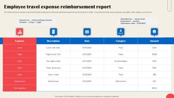 This slide includes an expense report which helps employees to reimburse expenses for approved business travel or activity. It includes elements such as expense, description, date, category, and amount. Pitch your topic with ease and precision using this Employee Travel Expense Reimbursement Report Topics Pdf This layout presents information on Category, Accommodation, Reimbursement Report It is also available for immediate download and adjustment. So, changes can be made in the color, design, graphics or any other component to create a unique layout. This slide includes an expense report which helps employees to reimburse expenses for approved business travel or activity. It includes elements such as expense, description, date, category, and amount.