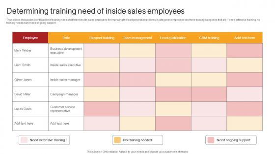 Thus slides showcases identification of training need of different inside sales employees for improving the lead generation process. It categories employees into three training categories that are need extensive training, no training needed and need ongoing support. Whether you have daily or monthly meetings, a brilliant presentation is necessary. Remote Sales Plan For Determining Training Need Of Inside Sales Employees Strategy SS V can be your best option for delivering a presentation. Represent everything in detail using Remote Sales Plan For Determining Training Need Of Inside Sales Employees Strategy SS V and make yourself stand out in meetings. The template is versatile and follows a structure that will cater to your requirements. All the templates prepared by Slidegeeks are easy to download and edit. Our research experts have taken care of the corporate themes as well. So, give it a try and see the results. Thus slides showcases identification of training need of different inside sales employees for improving the lead generation process. It categories employees into three training categories that are need extensive training, no training needed and need ongoing support.