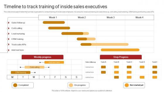 This slide showcases timeline that can help organization to conduct training of inside sales employees. Key areas for employee training are sales follow up, cold calling, lead nurturing, CRM training and tracking sales KPIs. Present like a pro with Remote Sales Plan For Timeline To Track Training Of Inside Sales Executives Strategy SS V. Create beautiful presentations together with your team, using our easy-to-use presentation slides. Share your ideas in real-time and make changes on the fly by downloading our templates. So whether you are in the office, on the go, or in a remote location, you can stay in sync with your team and present your ideas with confidence. With Slidegeeks presentation got a whole lot easier. Grab these presentations today. This slide showcases timeline that can help organization to conduct training of inside sales employees. Key areas for employee training are sales follow up, cold calling, lead nurturing, CRM training and tracking sales KPIs
