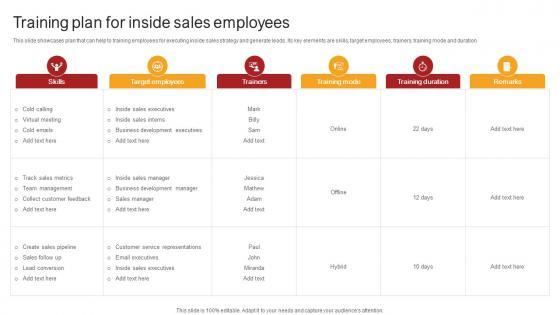This slide showcases plan that can help to training employees for executing inside sales strategy and generate leads. Its key elements are skills, target employees, trainers, training mode and duration. Do you have an important presentation coming up Are you looking for something that will make your presentation stand out from the rest Look no further than Remote Sales Plan For Training Plan For Inside Sales Employees Strategy SS V. With our professional designs, you can trust that your presentation will pop and make delivering it a smooth process. And with Slidegeeks, you can trust that your presentation will be unique and memorable. So why wait Grab Remote Sales Plan For Training Plan For Inside Sales Employees Strategy SS V today and make your presentation stand out from the rest This slide showcases plan that can help to training employees for executing inside sales strategy and generate leads. Its key elements are skills, target employees, trainers, training mode and duration.