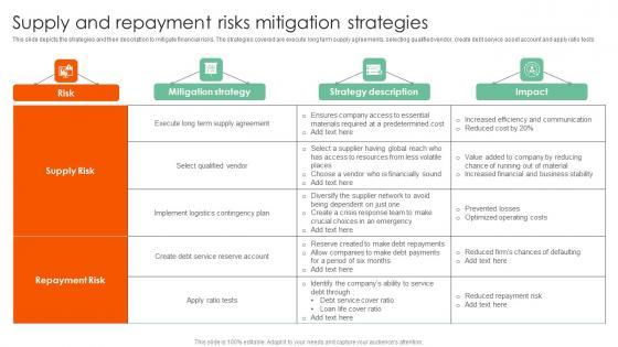 This slide depicts the strategies and their description to mitigate financial risks. The strategies covered are execute long term supply agreements, selecting qualified vendor, create debt service asset account and apply ratio tests. Slidegeeks is one of the best resources for PowerPoint templates. You can download easily and regulate Supply And Repayment Risks Complete Guide On How To Mitigate Portrait Pdf for your personal presentations from our wonderful collection. A few clicks is all it takes to discover and get the most relevant and appropriate templates. Use our Templates to add a unique zing and appeal to your presentation and meetings. All the slides are easy to edit and you can use them even for advertisement purposes. This slide depicts the strategies and their description to mitigate financial risks. The strategies covered are execute long term supply agreements, selecting qualified vendor, create debt service asset account and apply ratio tests.