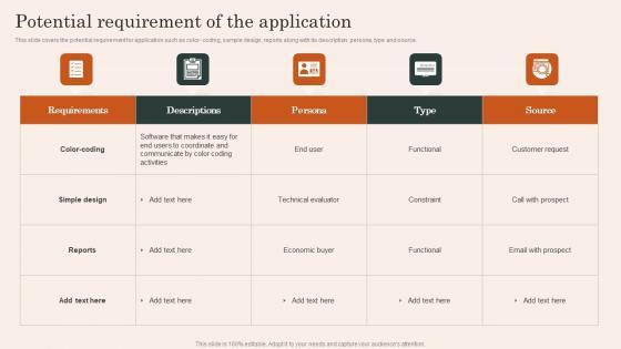 This slide covers the potential requirement for application such as color coding, sample design, reports along with its description, persona, type and source. Are you in need of a template that can accommodate all of your creative concepts This one is crafted professionally and can be altered to fit any style. Use it with Google Slides or PowerPoint. Include striking photographs, symbols, depictions, and other visuals. Fill, move around, or remove text boxes as desired. Test out color palettes and font mixtures. Edit and save your work, or work with colleagues. Download Potential Requirement Application Mobile App Development And Advertising Service Brochure Pdf and observe how to make your presentation outstanding. Give an impeccable presentation to your group and make your presentation unforgettable. This slide covers the potential requirement for application such as color coding, sample design, reports along with its description, persona, type and source.