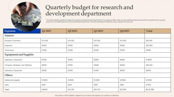 The slide exhibits quarterly budget of research and development department. The purpose of the slide is to allocate financial resources for the departments ongoing projects, and related expenses ensuring effective planning. It include expenditure related to salary, equipment, labor etc. Presenting Quarterly Budget For Research And Development Department Clipart PDF to dispense important information. This template comprises one stages. It also presents valuable insights into the topics including Salaries, Equipment Supplies, Laboratory Equipment. This is a completely customizable PowerPoint theme that can be put to use immediately. So, download it and address the topic impactfully.