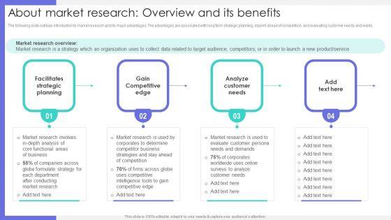 The following slide outlines introduction to market research and its major advantages. The advantages are associated with long term strategic planning, staying ahead of competition, and evaluating customer needs and wants. Create an editable Market Research To Determine Business Opportunities About Market Research Overview And Its Benefits Template PDF that communicates your idea and engages your audience. Whether youre presenting a business or an educational presentation, pre designed presentation templates help save time. Market Research To Determine Business Opportunities About Market Research Overview And Its Benefits Template PDF is highly customizable and very easy to edit, covering many different styles from creative to business presentations. Slidegeeks has creative team members who have crafted amazing templates. So, go and get them without any delay.